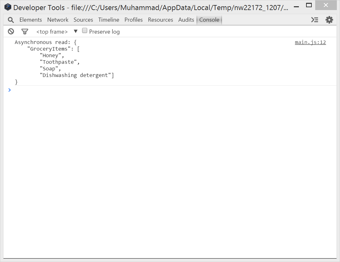Here we are reading the contents of GroceryItems.json using asyc readFile() provided from fs. After reading the contents of the file, it just logs it to the console.